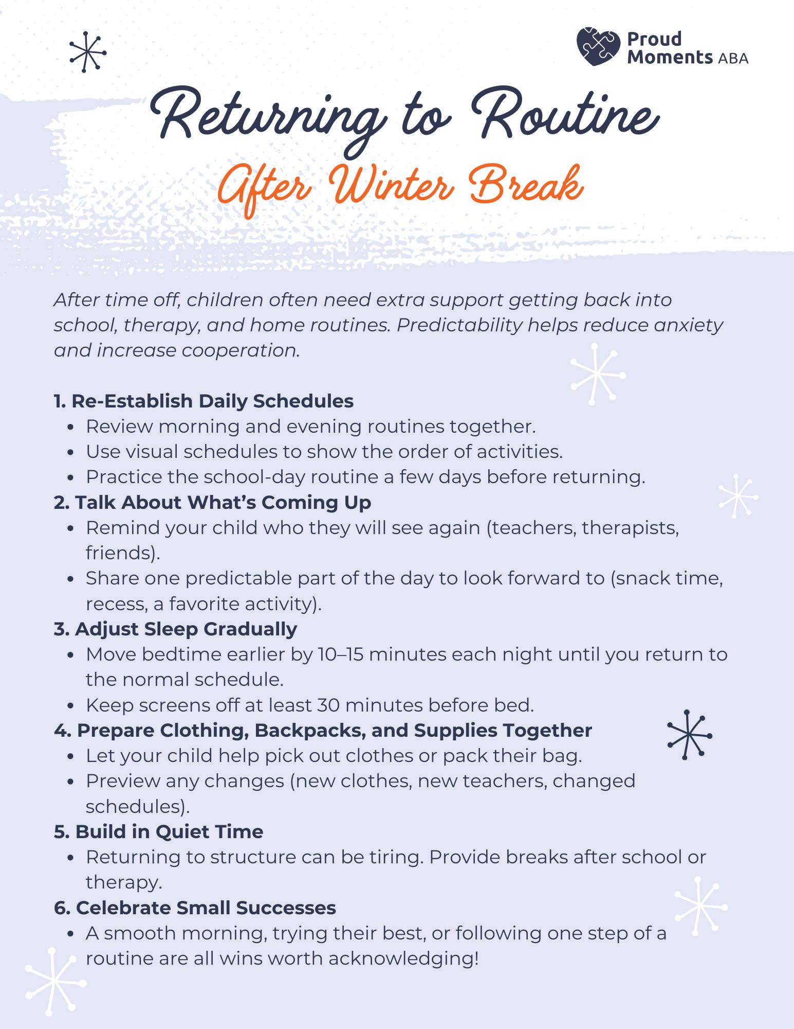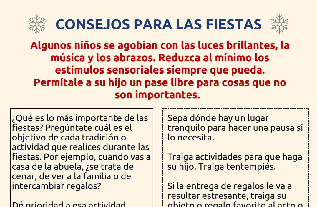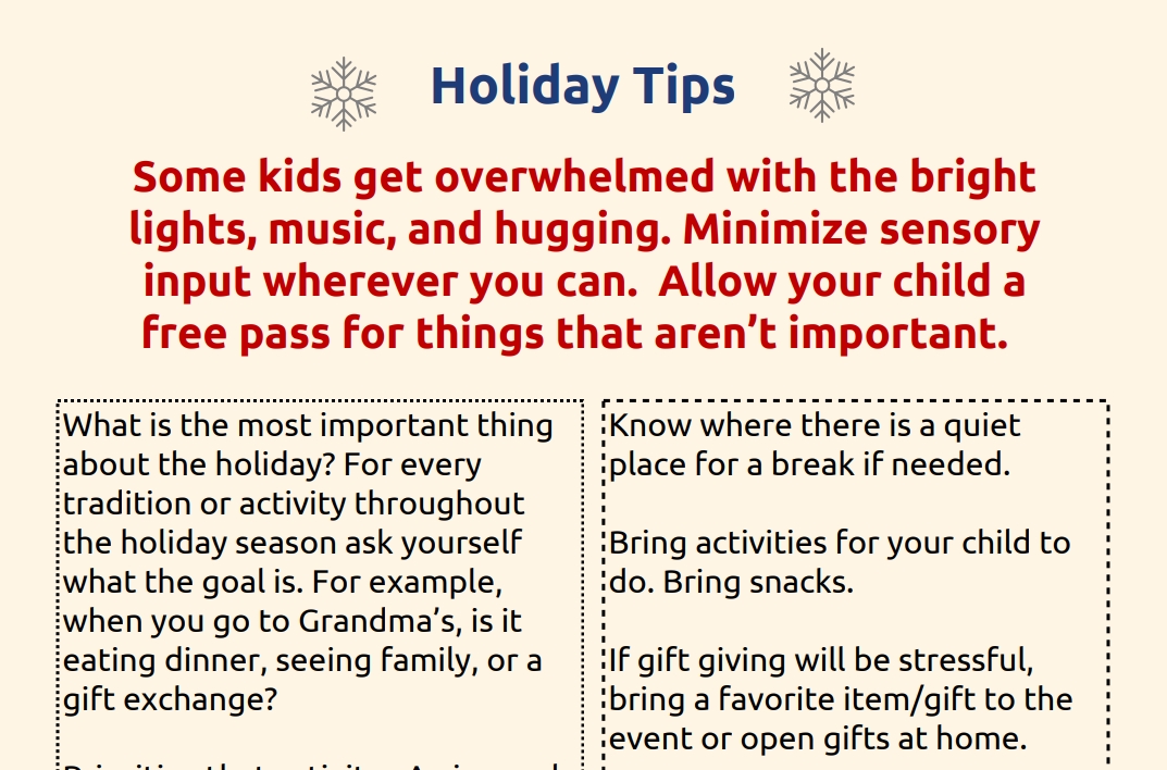 January Parent Tips: Winter Indoor Play January Parent Tips: Returning to Routine after Winter Break January Parent Tips: Dressing Independently New Year's Social Story Holiday Tips - Spanish Holiday Tips for Parents - English December Word Search December I Spy - Spanish December I Spy - English Pagination Current page 1 Page 2 Next page ›› Last page Last » Looking for more? Contact our team or explore the full Parent Resource Library.